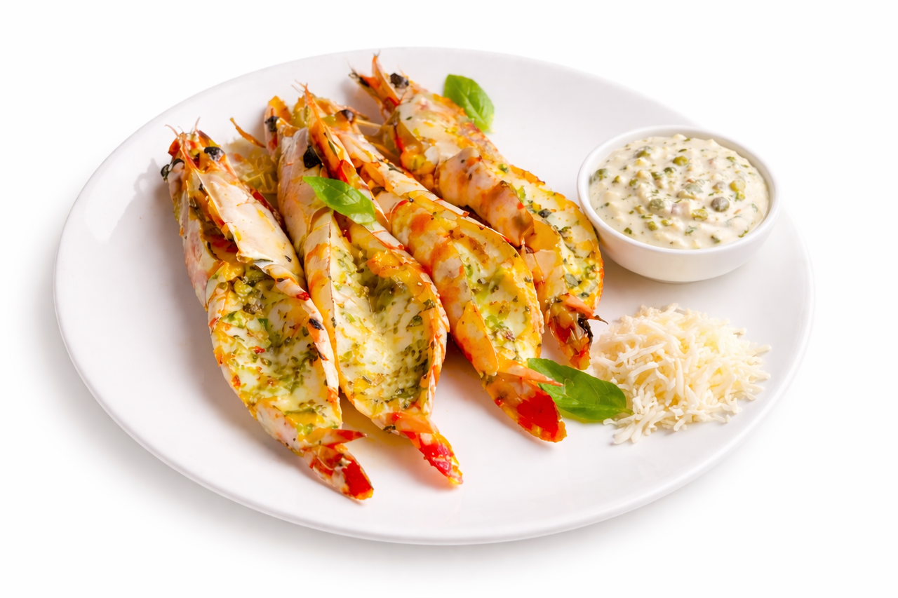 펼친블랙타이거새우 원물 위에 어니언 소스를 바르고, 모짜렐라 치즈를 올려준 후, 컨벡션 200℃ 약 10~15분 관찰 조리 후 바질 분말을 뿌려줍니다.