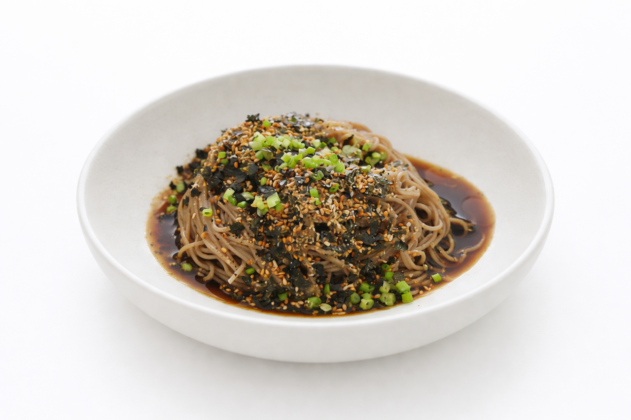 삶은 막국수 면에 막국수 쯔유를 넣고 버무린 후 조미김가루와, 들깨가루, 쪽파 등 고명을 올려 배식합니다.
