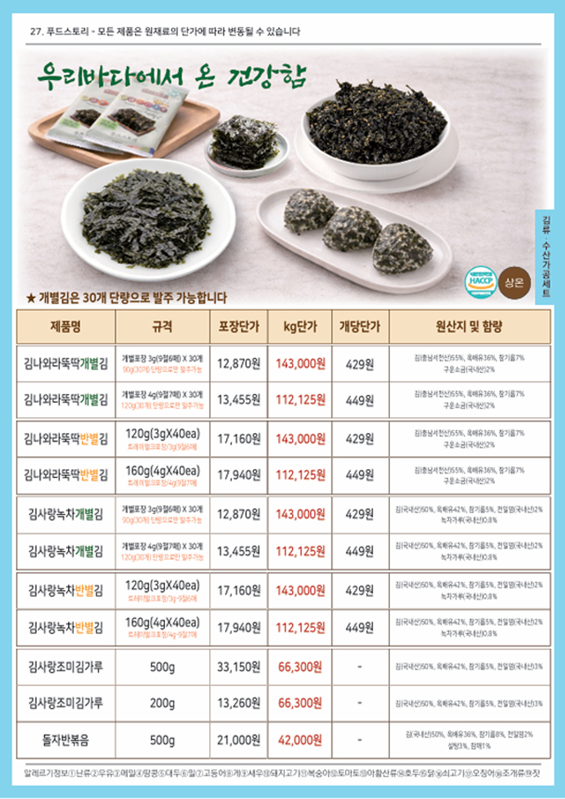 쌀(국내산), 참기름(볶은참깨가루:베트남산), 김(국내산), 기타가공품, 소금 외